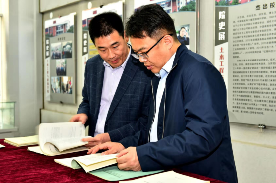随后,杨小林一行来到beat365在线唯一官网,参观了陈子荫先生塑像、beat365在线唯一官网院史展,翻阅了陈子荫先生生前保留的许多著作、论文、手稿等原件。王崇革为来宾介绍了学院的发展历程、学科和专业建设及杰出校友。来宾对以陈子荫先生为代表的冯豫、周文安、胡峰等老一辈专家学者集体对山科大矿井建设学科发展奠定了坚实的基础表达了敬意。之后,杨小林一行深入学院土木工程实验中心调研。